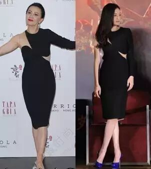 劉嘉玲穿上這套黑色禮服,十足的貴婦範,只是到哪都是一張大紅唇,能不能改改?這套對舒淇來說,算中規中矩了。