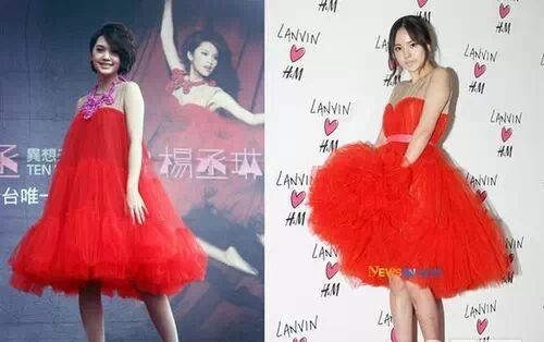 楊丞琳和韓國的閔孝琳,同樣配上這套大紅裙,一個收腰,一個披散,不失小女人的可愛。但是個人還是偏愛收腰款。