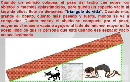 下次,你在電視裡觀看倒塌的建築物時,數一數這些形成的「三角」。你會發現到處都有這些三角。在倒塌的建築物裡,這是最常見的形狀。幾乎到處都有。我培訓Trujillo(人口約為75萬人的地方)的消防部門,教導人們如何求生,如何照顧他們的家人,以及如何在地震中援救他人。