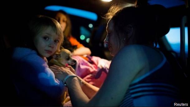 疏散造成63號高速公路堵車,提供床鋪和餐點的疏散點油砂營人滿為患。。。